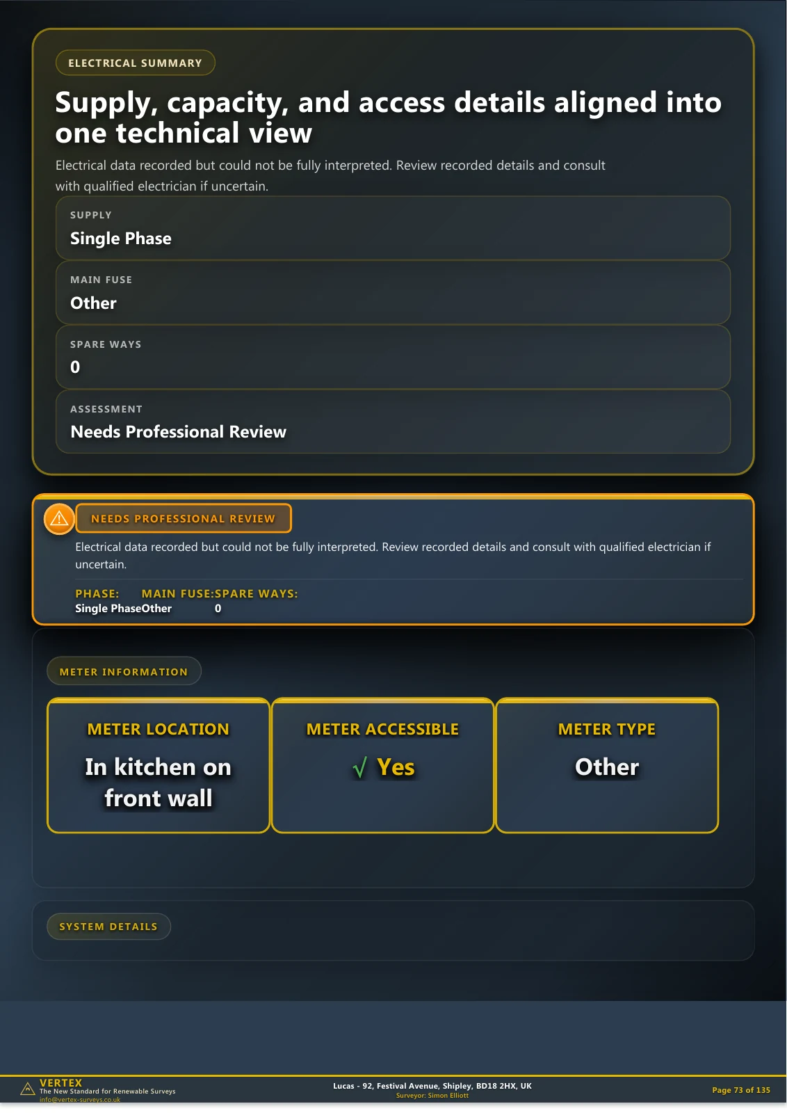 These are real pages from the generated survey pack for this BD18 record. They show what a normal West Yorkshire end-terrace looks like when the evidence is laid out properly for installer use.