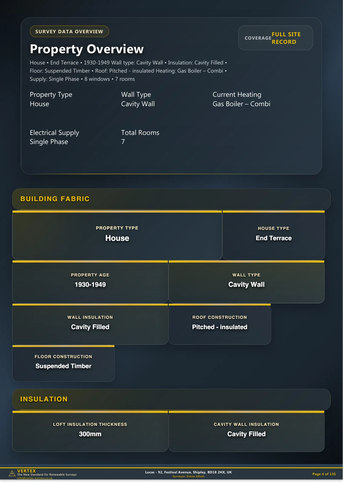 An anonymised Bradford district record from Shipley: 1930-1949 end-terrace house, cavity wall construction, gas combi baseline, and single-phase electrics.