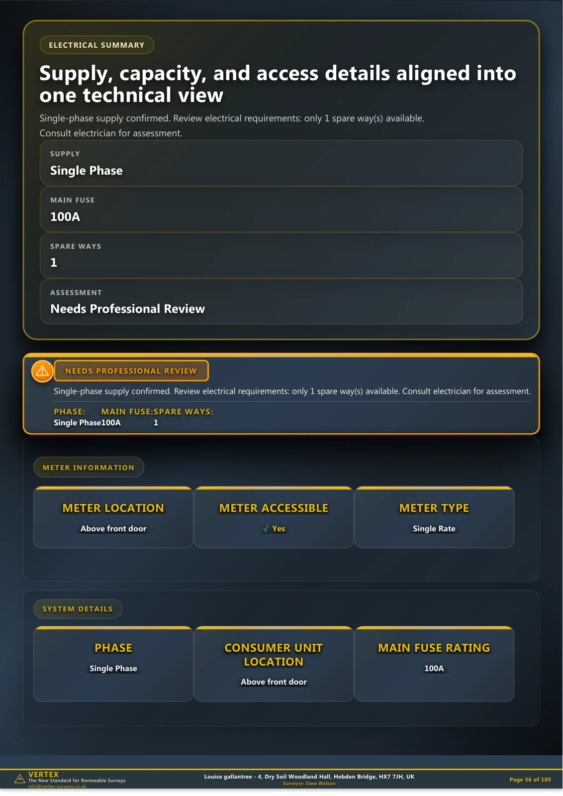 Meter, consumer unit, and spare-way context captured in a way installers can review quickly.