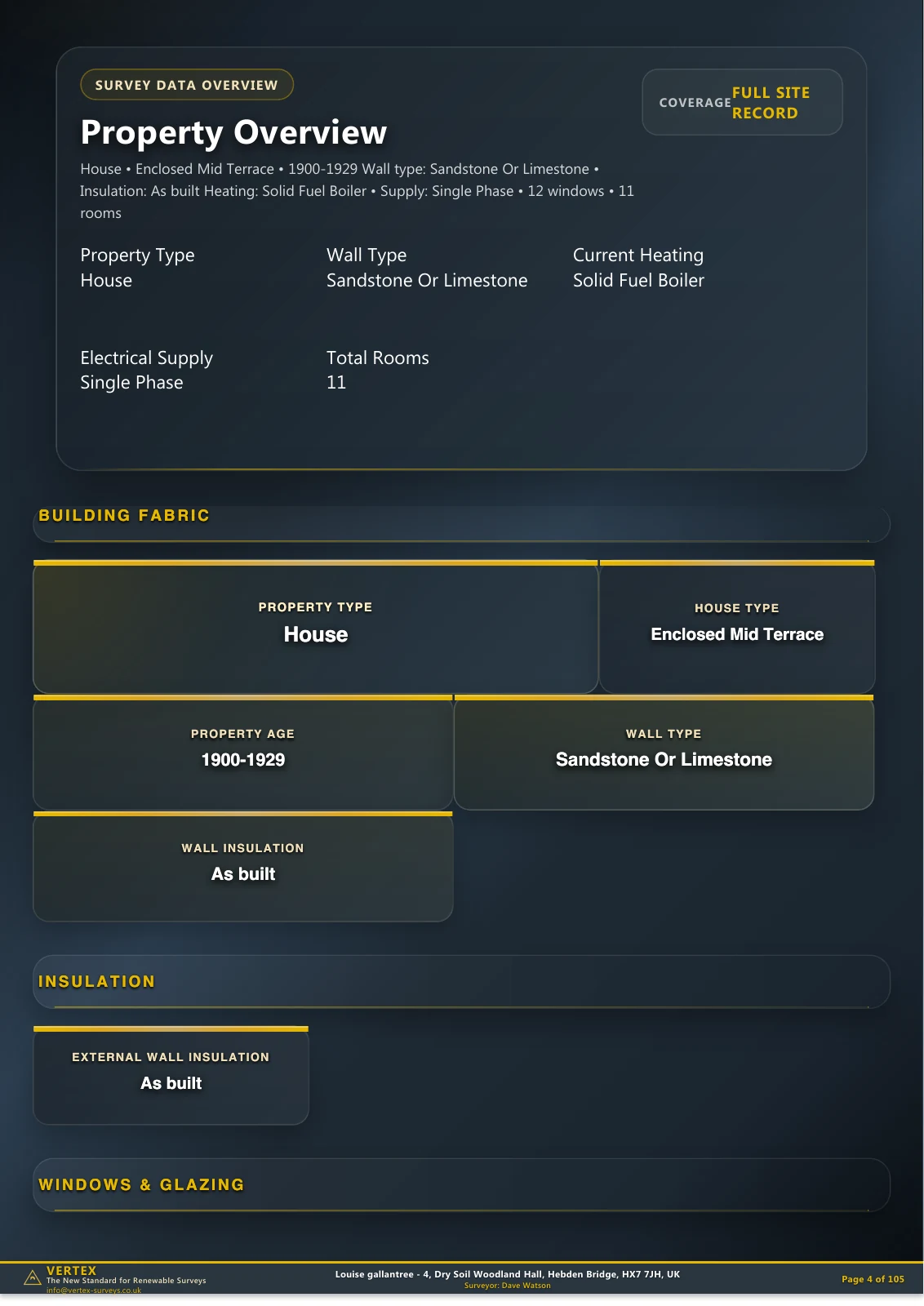 An anonymised HX7 record: 1900-1929 enclosed mid-terrace house, stone wall construction, solid-fuel boiler baseline, single-phase electrics, and four floorplan captures.